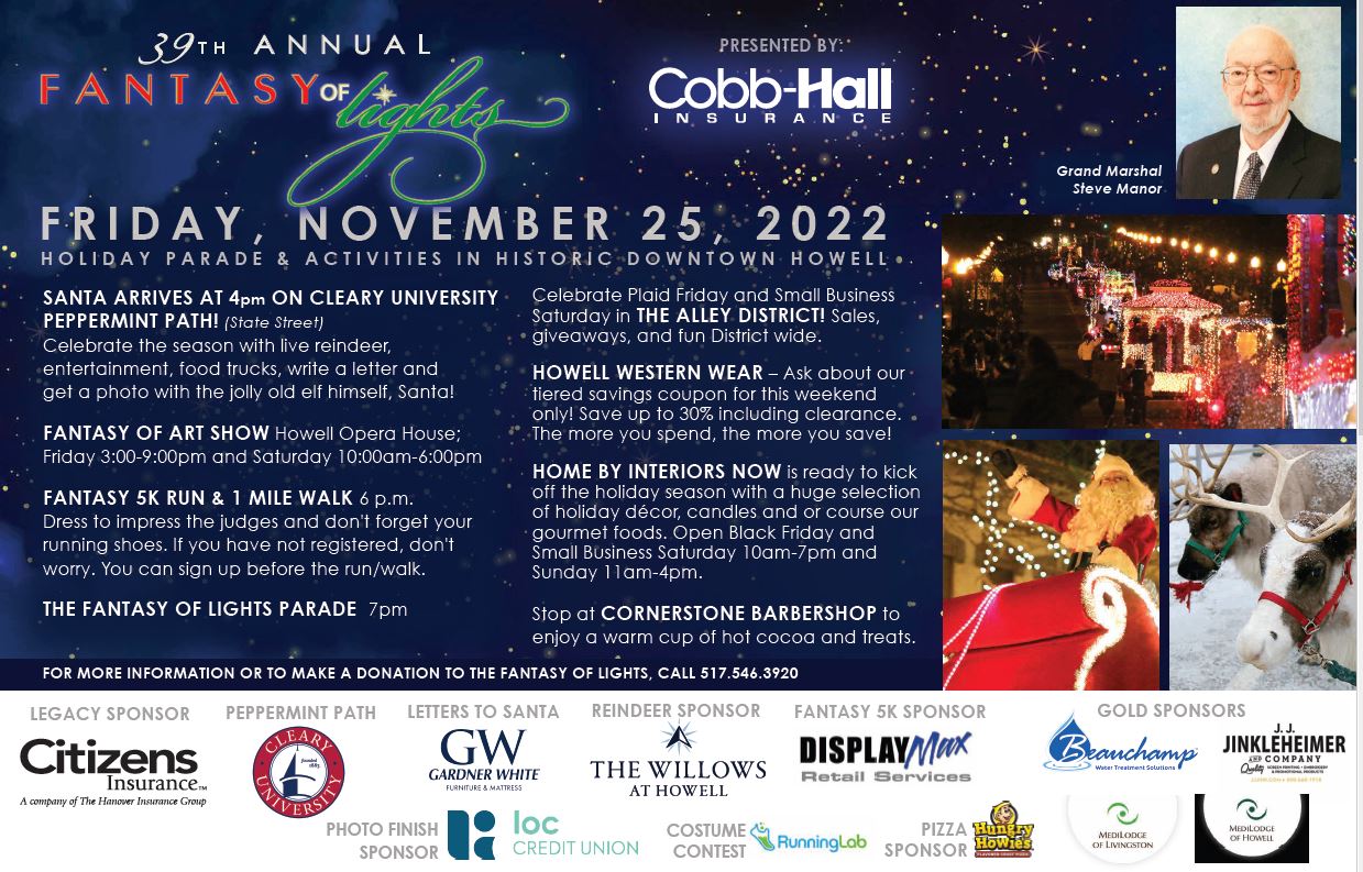 The main event of the evening is the Fantasy of Lights Parade, hosted by the Howell Area Chamber of Commerce Foundation. It has been the official kick-off to the holiday season in Howell for almost 40 years, becoming a holiday favorite for many families. When the lights go down, grab a hot chocolate and watch beautifully lit floats soar down Grand River along with local marching bands, first responders, special guests and the big guy himself, Santa!
